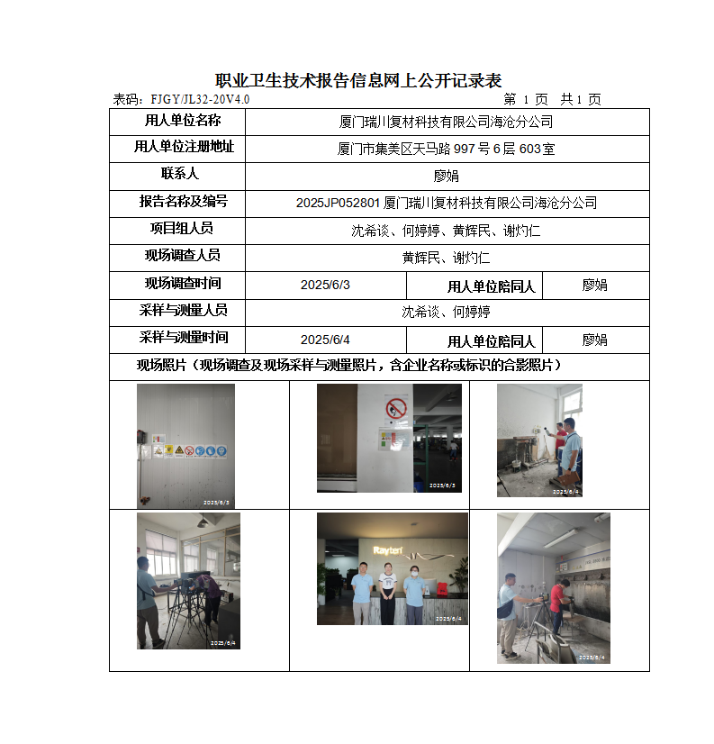 廈門瑞川復(fù)材科技有限公司海滄分公司-2025年工作場(chǎng)所職業(yè)病危害因素檢測(cè)