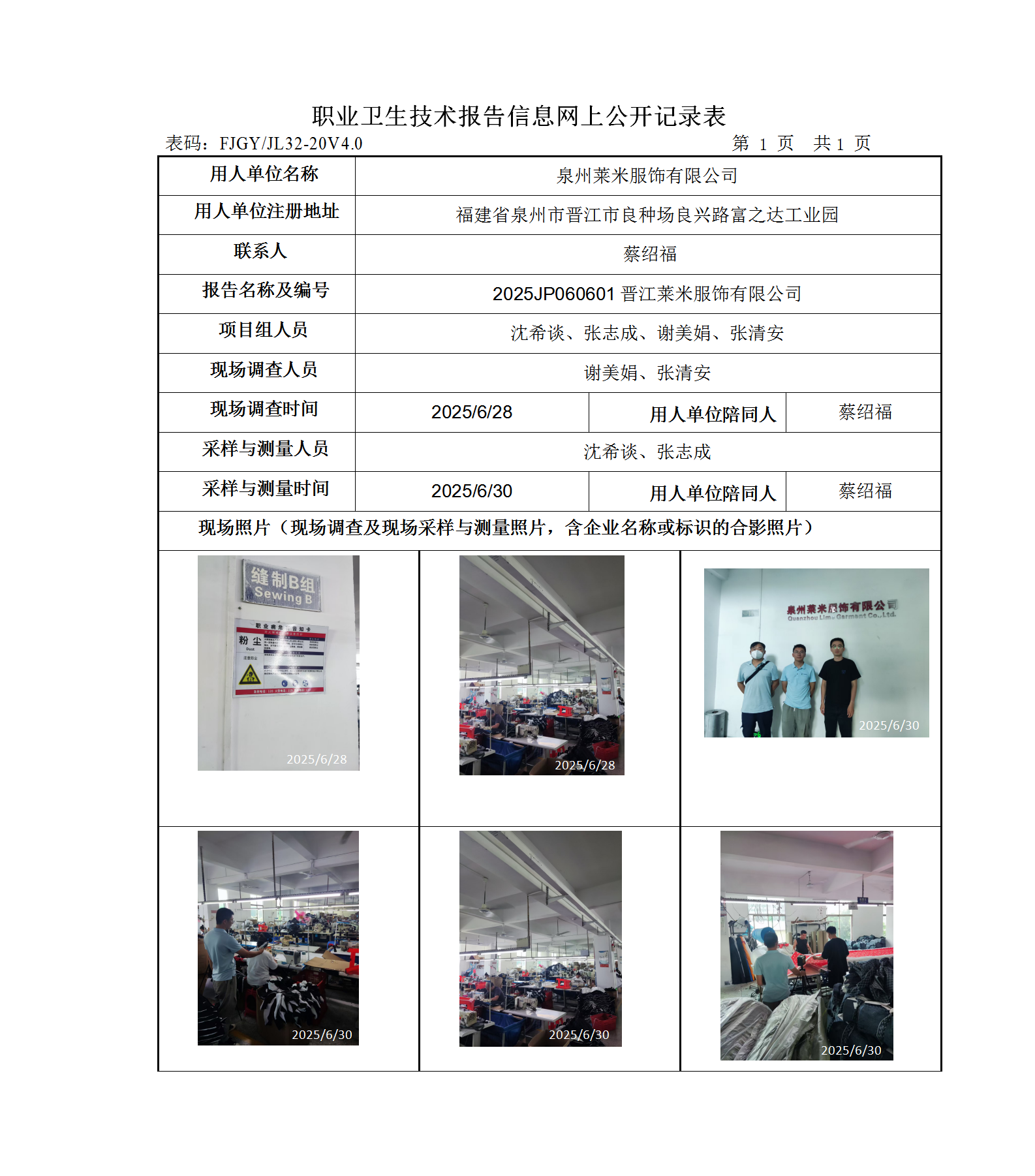 晉江萊米服飾有限公司-2025年工作場(chǎng)所職業(yè)病危害因素檢測(cè)